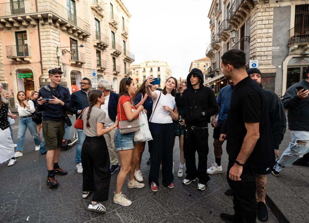 Tra un selfie e un autografo i catanesi hanno voluto salutare con affetto il cantante di Sesto San Giovanni, che ha approfittato della sosta siciliana per fare un tour per le vie del centro storico catanese e godersi una gustosa spremuta di arance in via Etnea.
