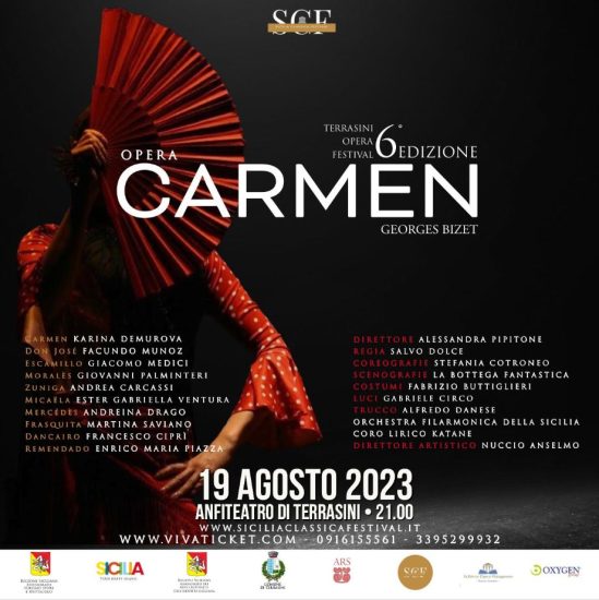 Lo spettacolo è inserito nel cartellone della sesta edizione del Terrasini Opera Festival ed è realizzato con il Patrocinio del Comune di Terrasini, della Regione Siciliana- Assessorato Turismo Sport e Spettacolo e Assessorato dei Beni Culturali e dell’Identità Siciliana, e dell’Assemblea Regionale Siciliana, ed è sponsorizzato dall’Oxygen Fitness Place di Palermo. La direzione artistica è affidata a Nuccio Anselmo con la regia di Salvo Dolce, Direttrice d’Orchestra Alessandra Pipitone, Coreografie di Stefania Cotroneo, Scenografie de La Bottega Fantastica, Costumi di Fabrizio Buttiglieri e Sartoria Pipi, Luci di Gabriele Circo. In scena l’Orchestra Filarmonica della Sicilia e il Coro Lirico Kàtane. La Carmen del Sicilia Classica Festival andrà in scena anche il prossimo 22 settembre 2023 alle ore 21 nella cornice di caratura internazionale del Teatro Antico di Taormina. Per l’occasione, si esibirà anche il Piccolo Coro Città di Taormina diretto dal Maestro Ivan Lo Giudice. Sempre al Teatro di Taormina la stessa Organizzazione porterà in scena, il 20 settembre alle ore 21, le opere Pagliacci di Leoncavallo e Cavalleria Rusticana di Mascagni. È possibile acquistare i biglietti consultando il sito ufficiale e la pagina fb della manifestazione.