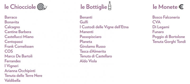 Ancora, alle cantine più interessanti va il massimo riconoscimento della Chiocciola (per le aziende in linea con i valori organolettici, territoriali e ambientali di Slow Food). Seguono poi i riconoscimenti come la Bottiglia, per i produttori che esprimono ottima qualità delle bottiglie presentate in degustazione, e la Moneta, per realtà con un buon rapporto qualità-prezzo.