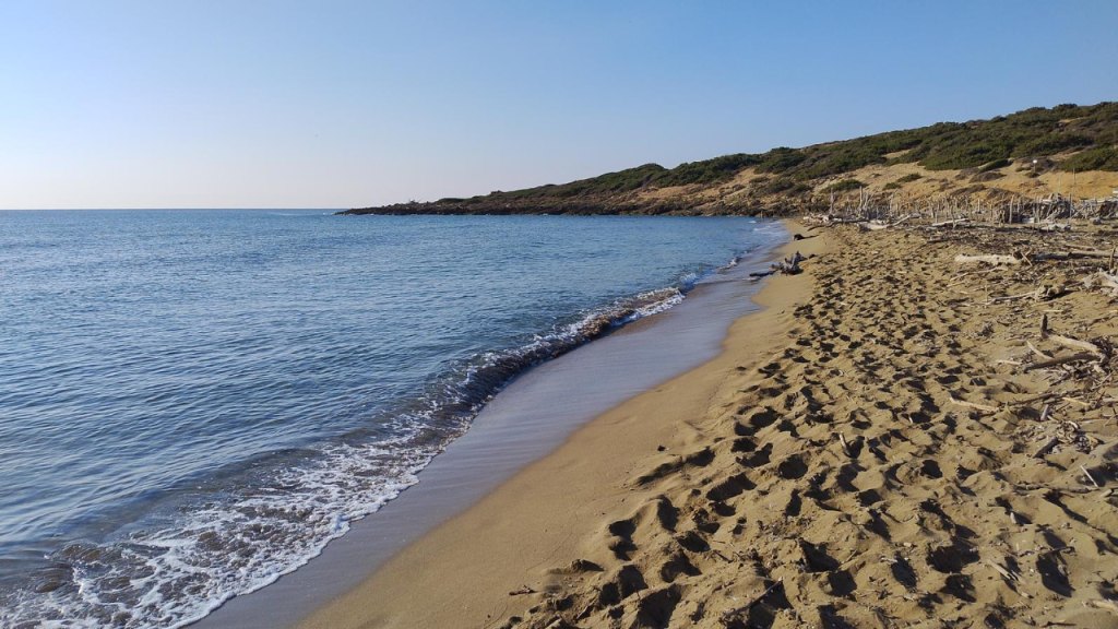 La baia, racchiusa tra due promontori, protegge il mare dal vento e mantiene l’acqua spesso calma. Si raggiunge con una camminata di circa un chilometro, tra macchia mediterranea e sentieri sabbiosi.