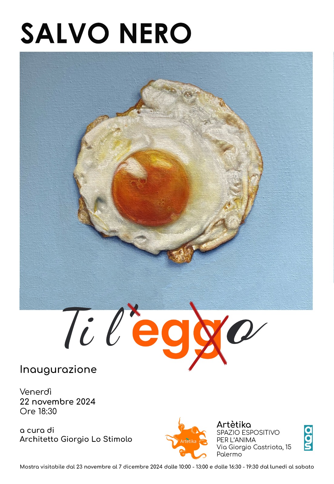 Perfetto ma non troppo, perché ogni dettaglio fuori posto fa la differenza, rendendo d’impatto un’opera dal tratto rotondo. È la caratteristica principale dello stile del pittore, fumettista, grafico e writer Salvo Nero, diviso tra il narcisismo del proprio ego e il romanticismo del legame invisibile e indissolubile che unisce due innamorati. Da venerdì 22 novembre a sabato 7 dicembre, sarà in mostra con Ti l’Eggo da Artètika, spazio espositivo per l’anima, in via Giorgio Castriota, 15 a Palermo. Il vernissage avverrà venerdì 22, alle ore 18,30, alla presenza dell’artista, delle galleriste Gigliola Beniamino e Esmeralda Magistrelli, del curatore, l’architetto Giorgio Lo Stimolo e del critico Massimiliano Reggiani. La mostra sarà visitabile dal lunedì al sabato, dalle 10,00 alle 13,00 e dalle 16,30 alle 19,30. Ingresso libero. Sponsor d’arte Birra Forst e Tenute Cinquanta.
