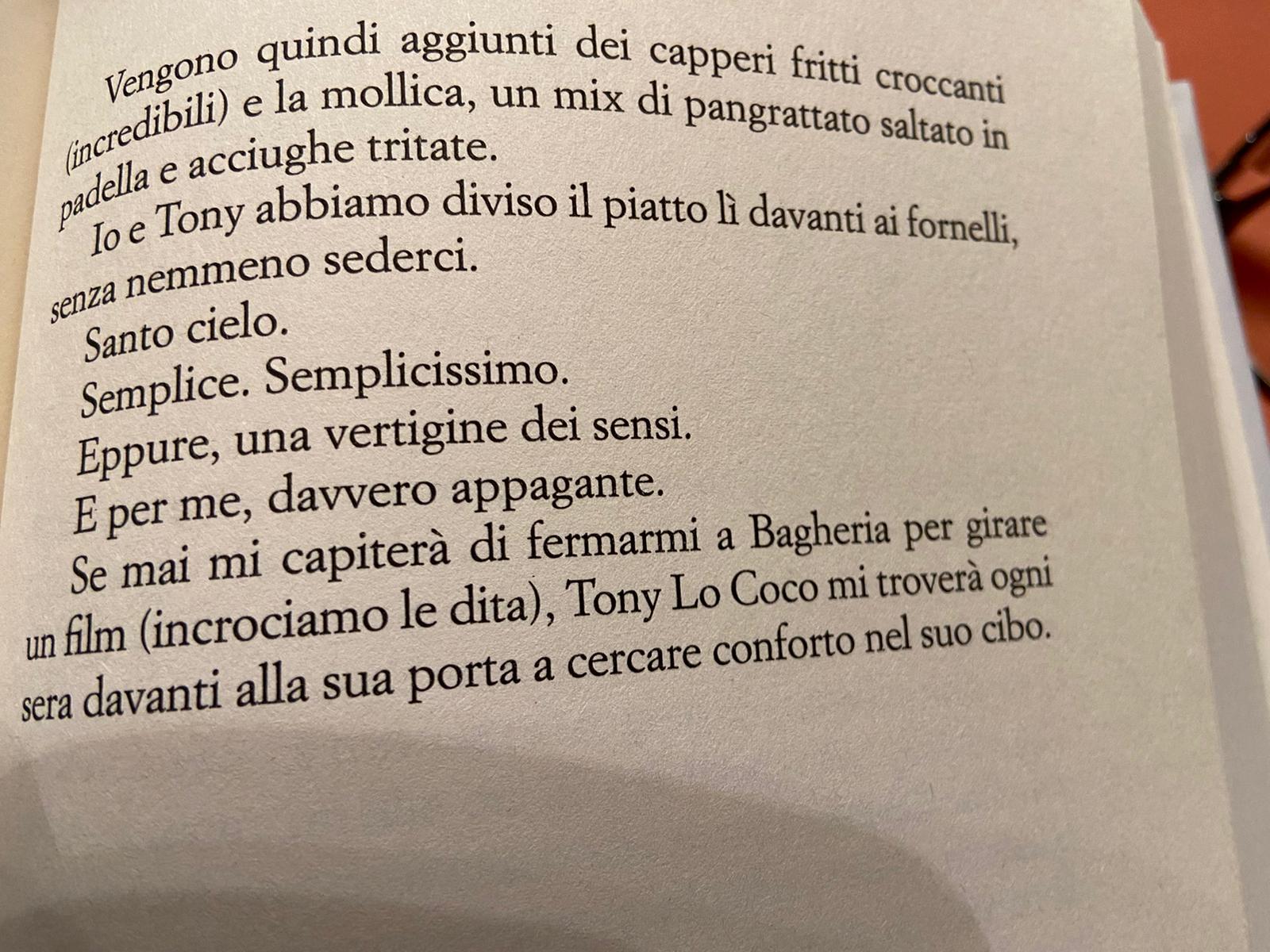 Nel libro, Tucci parla della ricetta, scrivendo: “(…) Vengono quindi aggiunti dei capperi fritti croccanti (incredibili) e la mollica, un mix di pangrattato saltato in padella e acciughe tritate. Io e Tony abbiamo diviso il piatto lì davanti ai fornelli, senza nemmeno sederci. Santo cielo. Semplice. Semplicissimo. Eppure, una vertigine dei sensi. E per me, davvero appagante”.