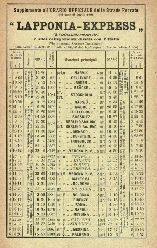 Dall’orario ferroviario del LAPPONIA-EXPRESS, supplemento all’orario Ufficiale delle strade Ferrate, ci si può rendere conto che il percorso durava 6 giorni. I viaggiatori di questo treno, i nobili dei primi del ‘900, durante il percorso potevano ammirare dal finestrino i vari paesaggi tipici dei paesi cha attraversavano.