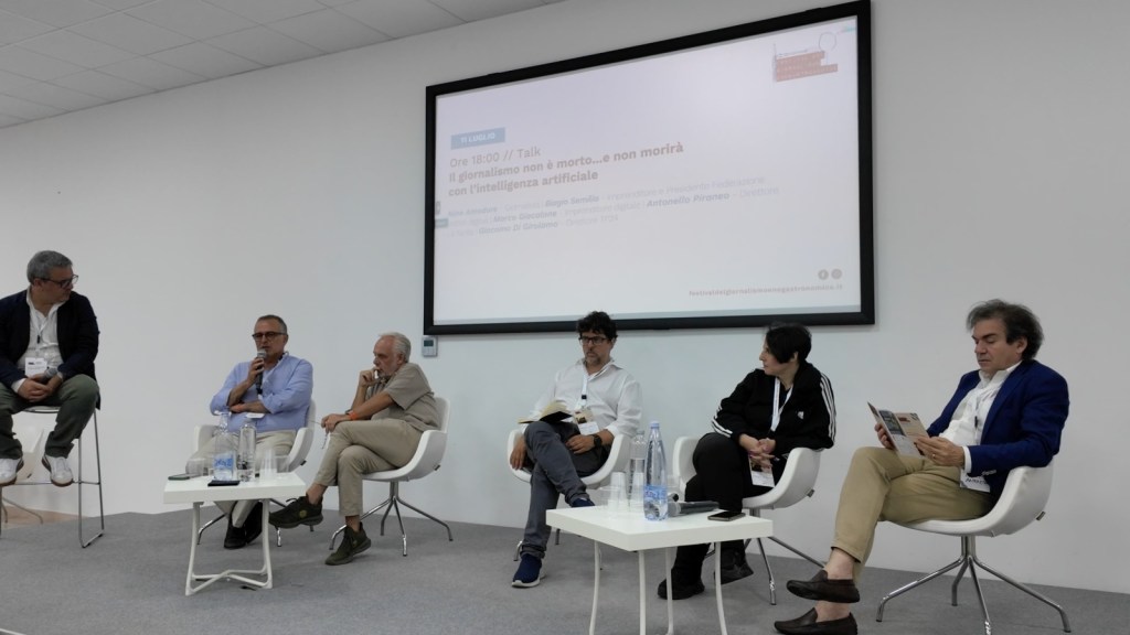 A seguire si è tenuto un talk dal titolo provocatorio: “Il giornalismo non è morto… e non morirà con l’intelligenza artificiale”. Un confronto vivace tra esperti del settore, che ha visto la partecipazione di Nino Amadore, Biagio Semilia, Antonello Piraneo (direttore de La Sicilia), Giacomo Di Girolamo (direttore di TP24), l’editore di Sudpress Pierluigi Di Rosa e la ricercatrice universitaria Giuliana Sorci.