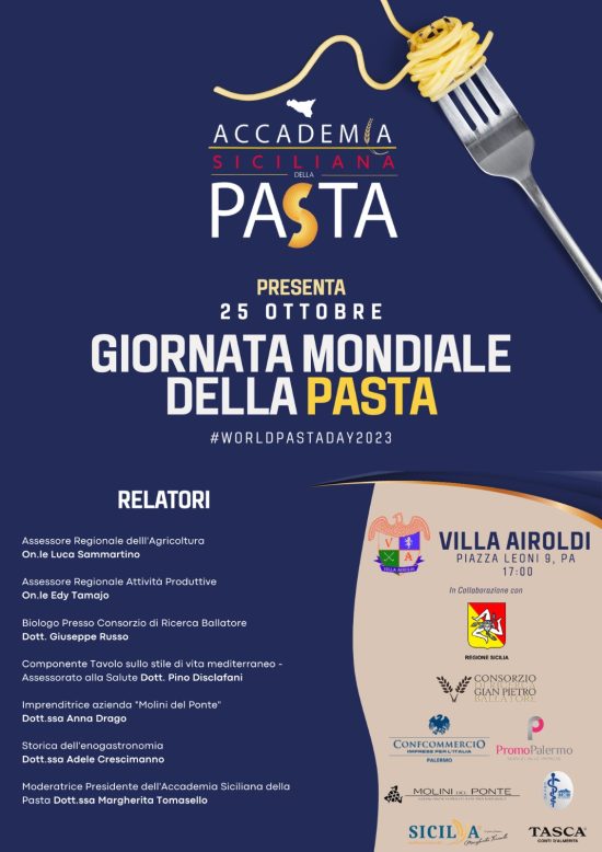 Come ogni anno, l’ Accademia Siciliana della Pasta, il 25 ottobre ( ma non solo) si impegna a divulgare ed a sostenere il più importante prodotto della tavola degli italiani. Per farlo ha deciso di organizzare un incontro importante, vista la presenza dell’Assessore Regionale Siciliano dell’Agricoltura e dell’Assessore Regionale Siciliano delle Attività Produttive in occasione del quale si parlerà di quello che è e di quello che sarà la pasta all’interno del comparto dell’agricoltura siciliana, dell’internazionalizzazione del prodotto e delle nuove prospettive per uno sviluppo dell’industria della pasta.